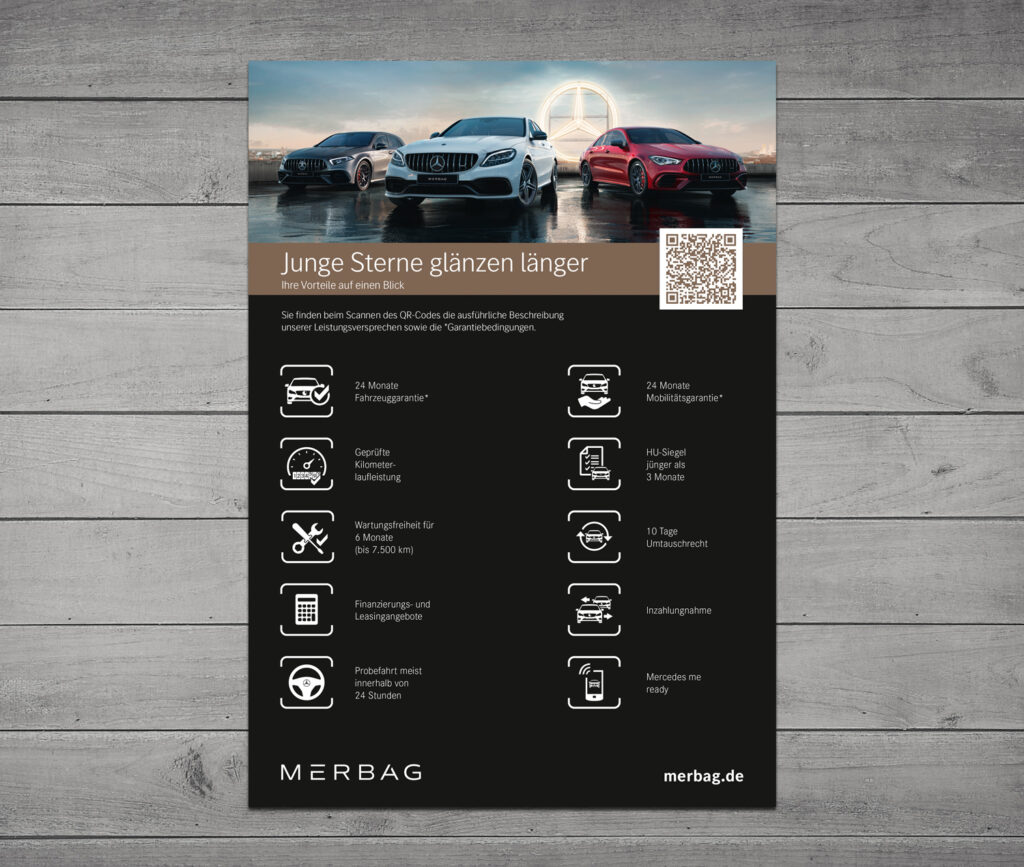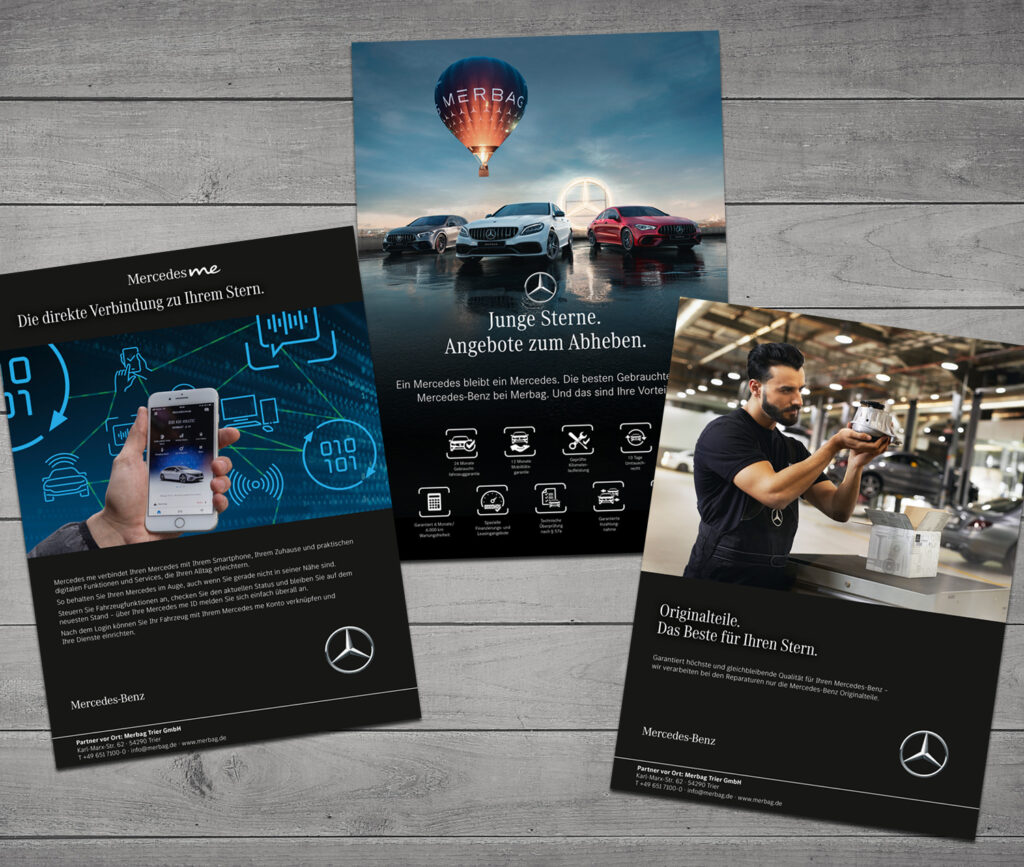 Für Merbag haben wir aufmerksamkeitsstarke Flyer und Anzeigen entwickelt, die gezielt das neue, europaweit einheitliche Markendesign zum Ausdruck bringen. Mit eleganter Typografie und einer Bildsprache in Schwarz, Weiß und Gold-Bronze transportieren die Printmittel die Werte „Qualität, Ehrlichkeit und Kompetenz“ und unterstreichen Merbags Premium-Positionierung im internationalen Mercedes‑Benz-Netzwerk.